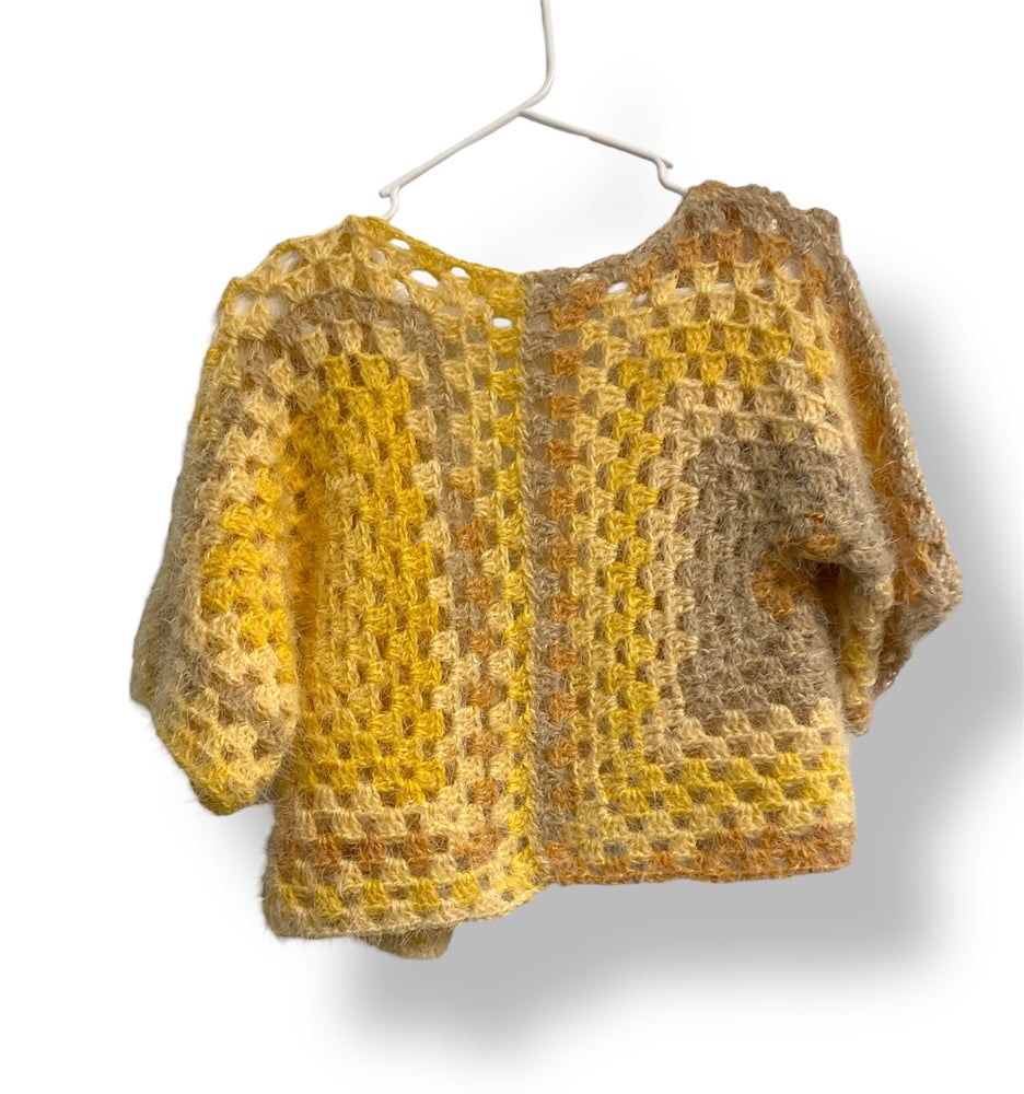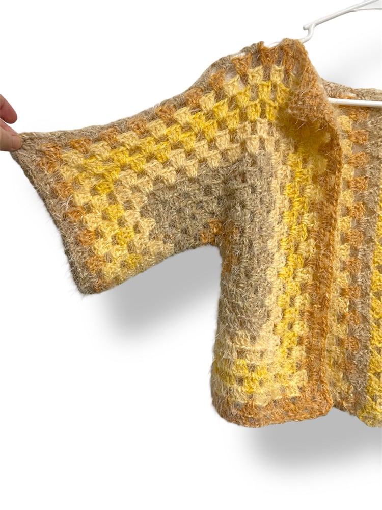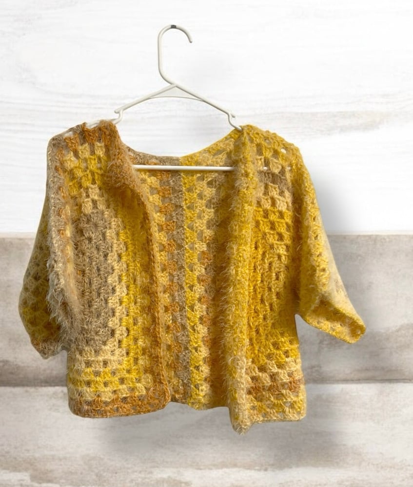 This fuzzy, soft cardigan is crafted in a muted variegated yellow that adds a gentle touch of color to any outfit. The texture is plush and inviting, perfect for kids who love comfort. Hand crocheted details make this piece truly one of a kind, with subtle shifts in color that create a warm and cozy fall look.