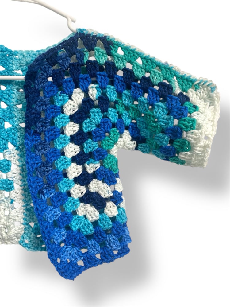 This hand crocheted cardigan blends soft hues of blue and white for a gentle, cloudlike look. Its cozy texture and lightweight feel make it perfect for layering on cool fall days. Every stitch is crafted with care, giving this tiny cardigan its own one-of-a-kind charm.